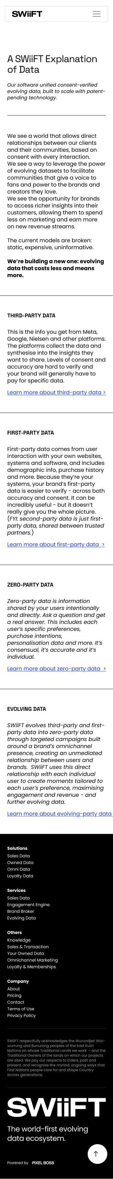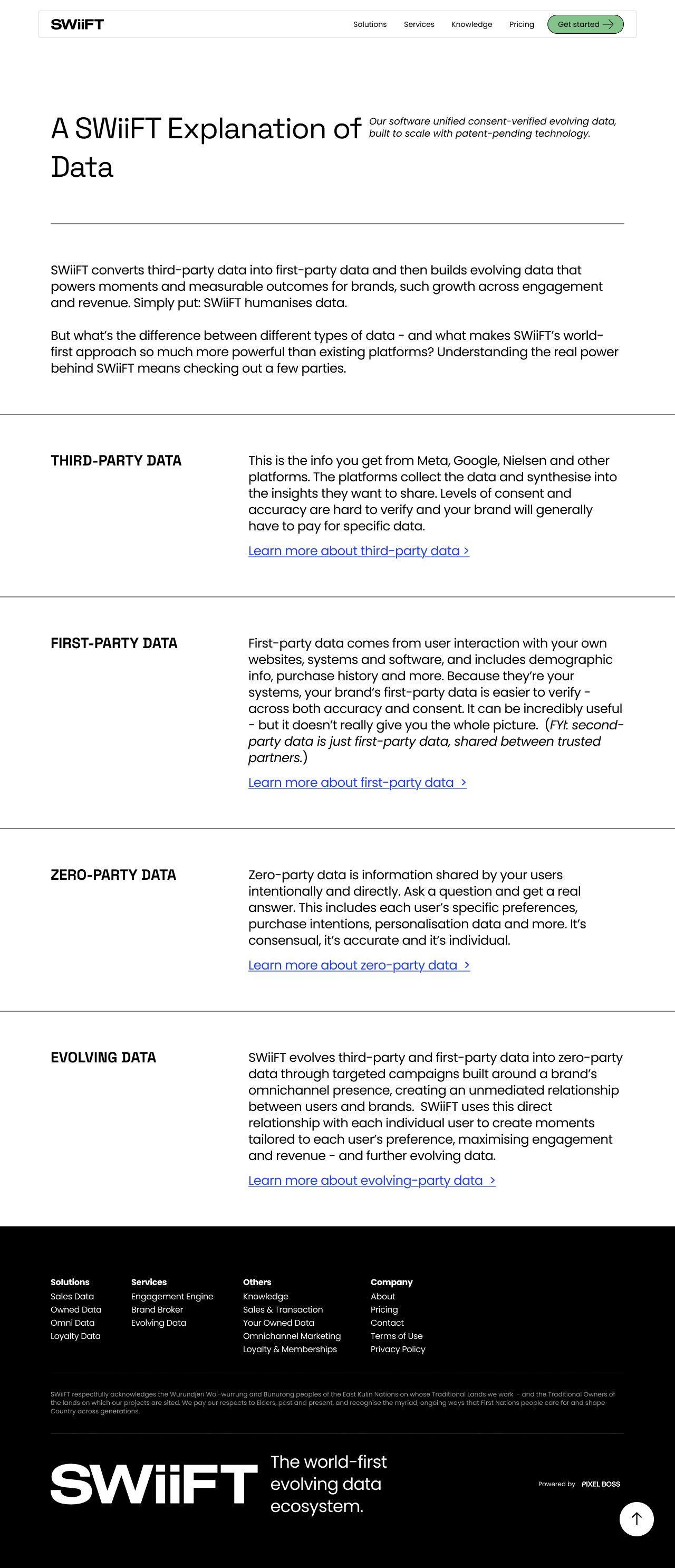 First-party data is easy to collect and extremely powerful. Because your brand has collected it directly, you can verify both accuracy and consent practices. However, this data is generally collected as part of a necessary process, such as a purchase. It’s personalised but it’s not really personal. Your brand can look at an individual customer’s first-party data and get an outline of that person. SWiiFT immediately targets first-party data from the first interaction with your community, our strategies are designed to evolve third-party data from socia media and other less personalised platforms into first-party data and beyond, creating valuable, actionable insights for your brand. Interested in growing your first-party data? Request access to SWiiFT today.